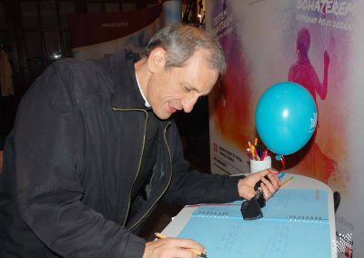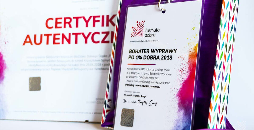 Zanim nastąpiła licytacja identyfikatora, podsumowaliśmy tegoroczną kampanię. Wszak wyruszyliśmy na Wyprawę Po 1% Dobra, by edukować, informować, promować, poznawać i dać się poznać. Od stycznia do kwietnia, przejechaliśmy łącznie 1050 km. Rozdaliśmy 1750 Baloników z Karteczkami z Dobrym Słowem, opowiadając o tym, że są symbolem naszych małych Podopiecznych. Wszak z każdego balonika uchodzi kiedyś powietrze, niczym życie, ale zostaje po nim dobre słowo. 2780 zakładek do książek, trafiło do rąk mieszkańców odwiedzanych miast, informując o możliwości przekazania na naszą rzecz 1% procenta podatku. O 190 powiększyła się liczba nowych wpisów do Księgi Dobra. Będziemy mieli na długi czas zapas Dobrych Słów dla potrzebujących. 31 wolontariuszy i 28 pracowników w tym lekarzy, pielęgniarek, terapeutów, zabezpieczało informacyjnie nasze Mobilne Punkty Poboru Dobra. Byliśmy wraz z 3 rodzinami naszych podopiecznych do dyspozycji zainteresowanych osób, informując o idei hospicjum domowego dla dzieci. Podczas wydarzeń gościliśmy liczne osobistości: Rektorów, Posłów na Sejm, Prezydentów Miast, Burmistrzów, Wójtów. Konwój Dobra zaowocował również konkretną sumą pieniędzy. Zebraliśmy kwotę 14012,66 zł! To ponad 200 godzin dodatkowej rehabilitacji dla naszych małych podopiecznych!