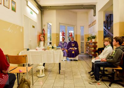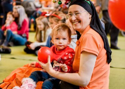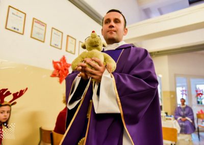 O godzinie trzynastej rozpoczęliśmy spotkanie. Najpierw msza święta, którą odprawił ksiądz Tomek Filinowicz, kapelan hospicjum Formuła Dobra, modlił się za pacjentów, rodziny i pracowników Formuły Dobra razem z księdzem Jakubem Bartczakiem: pluszakowo-rapowane kazanie trafiło do serc i małych i dużych, wszyscy zapamiętali najważniejsze: zawsze wybierać dobro.