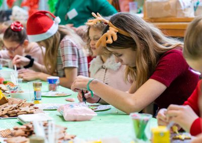 Serca dzieciaków skradły warsztaty ozdabiania pierniczków – do tego słodkiego szaleństwa nie trzeba nikogo namawiać. Warsztaty plastyczne zgromadziły drugą grupę dzieciaków. Na chętnych czekała też pani Wiesława Kucięba, bajkopisarka z niedalekiej Trzebnicy. (Dziękujemy, że po raz kolejny poświeciła Pani nam swój czas, talent i dała uśmiech).